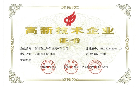 近日,湖北路橋瑞達(dá)檢測公司收到由湖北省科學(xué)技術(shù)廳、湖北省財政廳、國家稅務(wù)總局湖北省稅務(wù)局共同頒發(fā)的“高新技術(shù)企業(yè)”證書,這是瑞達(dá)檢測公司首次榮獲此項認(rèn)定,標(biāo)志著瑞達(dá)檢測公司在科技創(chuàng)新和產(chǎn)業(yè)升級方面取得了重要突破,正式邁入國家高新技術(shù)企業(yè)行列。