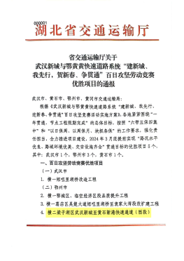 近日,湖北省交通運輸廳發(fā)布兩則關(guān)于武漢新城與鄂黃黃快速道路系統(tǒng)建設(shè)的通報,由湖北路橋承建的吳楚大道項目、高新八路一期項目分別獲評年度“紅旗”項目、百日攻堅勞動競賽優(yōu)勝項目。