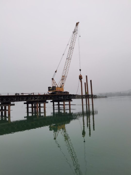 依托丹江口市水都二橋工程,通過“板凳+局部錨固”鋼管樁抗高流速水情施工技術(shù)、鋼管樁沉樁無引孔技術(shù)及鋼棧橋快速裝配施工技術(shù)等關(guān)鍵技術(shù),順利完成了鋼棧橋施工。通過鋼管樁直接振動沉樁形成“板凳樁”,提高了棧橋橫向穩(wěn)定性,同時直接振打鋼管樁沉樁,管內(nèi)無需澆筑砼,提高了施工效率,降低了施工成本,此外,依次裝配安裝鋼棧橋各類裝配構(gòu)件以及裝配式定位導(dǎo)向架,減少了大量現(xiàn)場焊接工作,加快了施工速度,具有較好的推廣應(yīng)用前景。