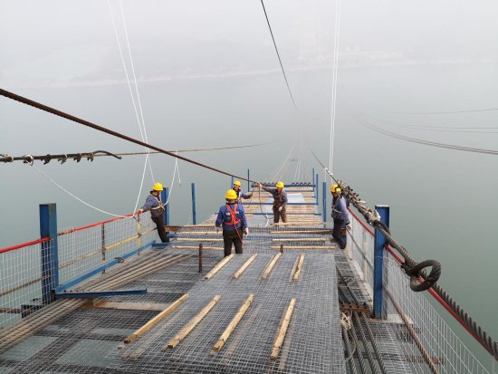 貓道在懸索橋施工中扮演著至關(guān)重要的角色,是懸索橋上部結(jié)構(gòu)作業(yè)極其重要的高空施工平臺,又被稱為懸空的“生命線”,貫穿索股牽引、緊纜、吊索安裝、主纜纏絲等一系列工序。