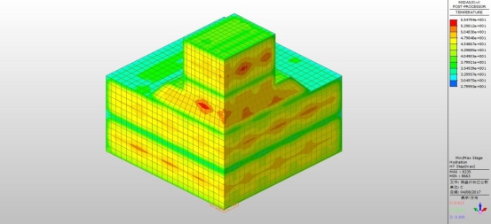 大體積混凝土水化熱分析對保障混凝土結(jié)構(gòu)的耐久性、安全性和施工效率具有重要意義。通過水化熱分析能預(yù)測混凝土內(nèi)部溫度的變化,并根據(jù)分析結(jié)果合理布置冷水管,從而減少溫度應(yīng)力,降低混凝土結(jié)構(gòu)變形和開裂的風(fēng)險(xiǎn)。