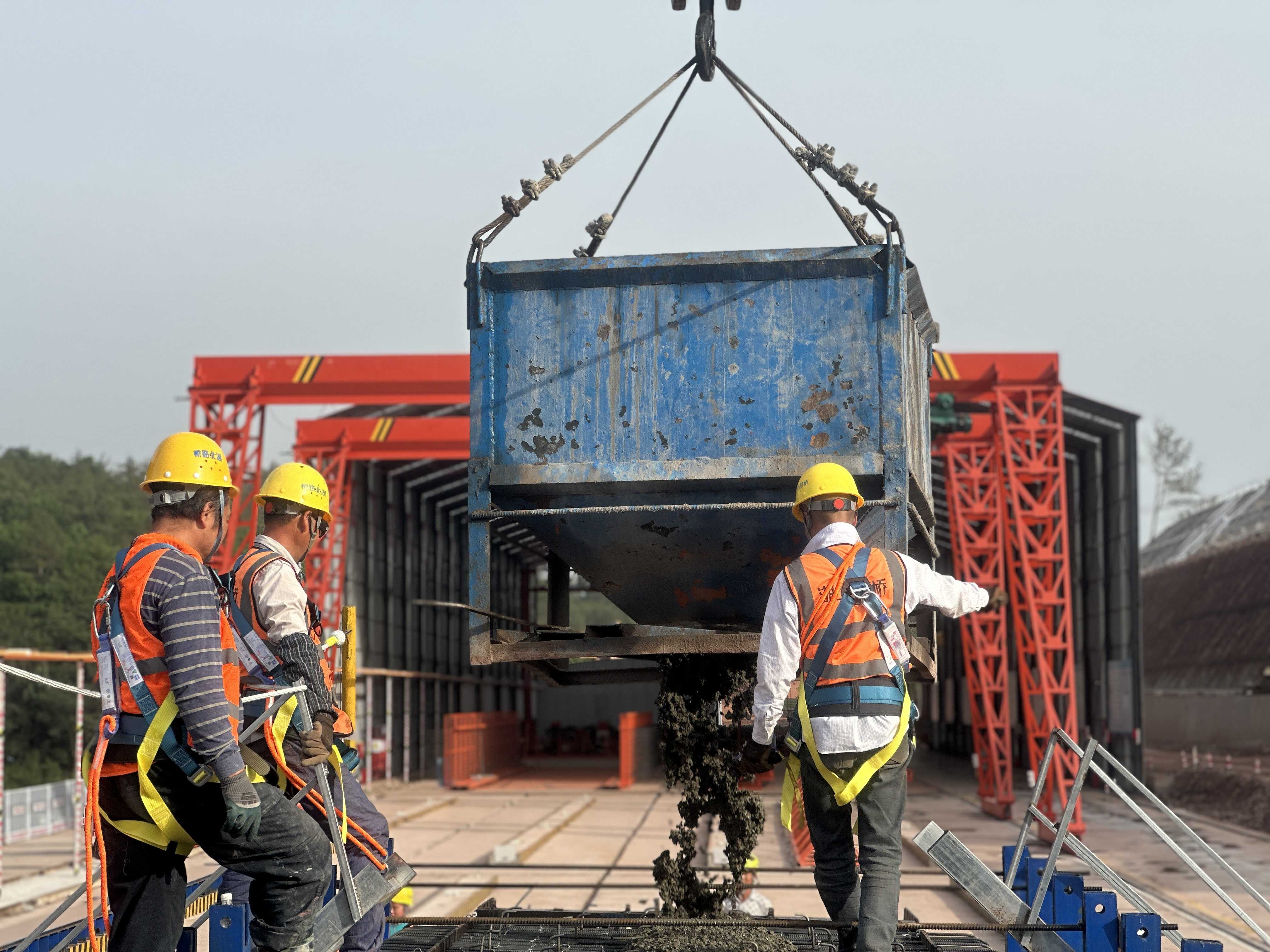 走進項目預(yù)制梁場,工友們正有序準備梁片預(yù)制材料。根據(jù)施工計劃,標段全線共需預(yù)制1683片T梁。4月底,項目已完成駐馬溪大橋右幅首片T梁澆筑,拉開了項目橋梁上部結(jié)構(gòu)施工的序幕。
